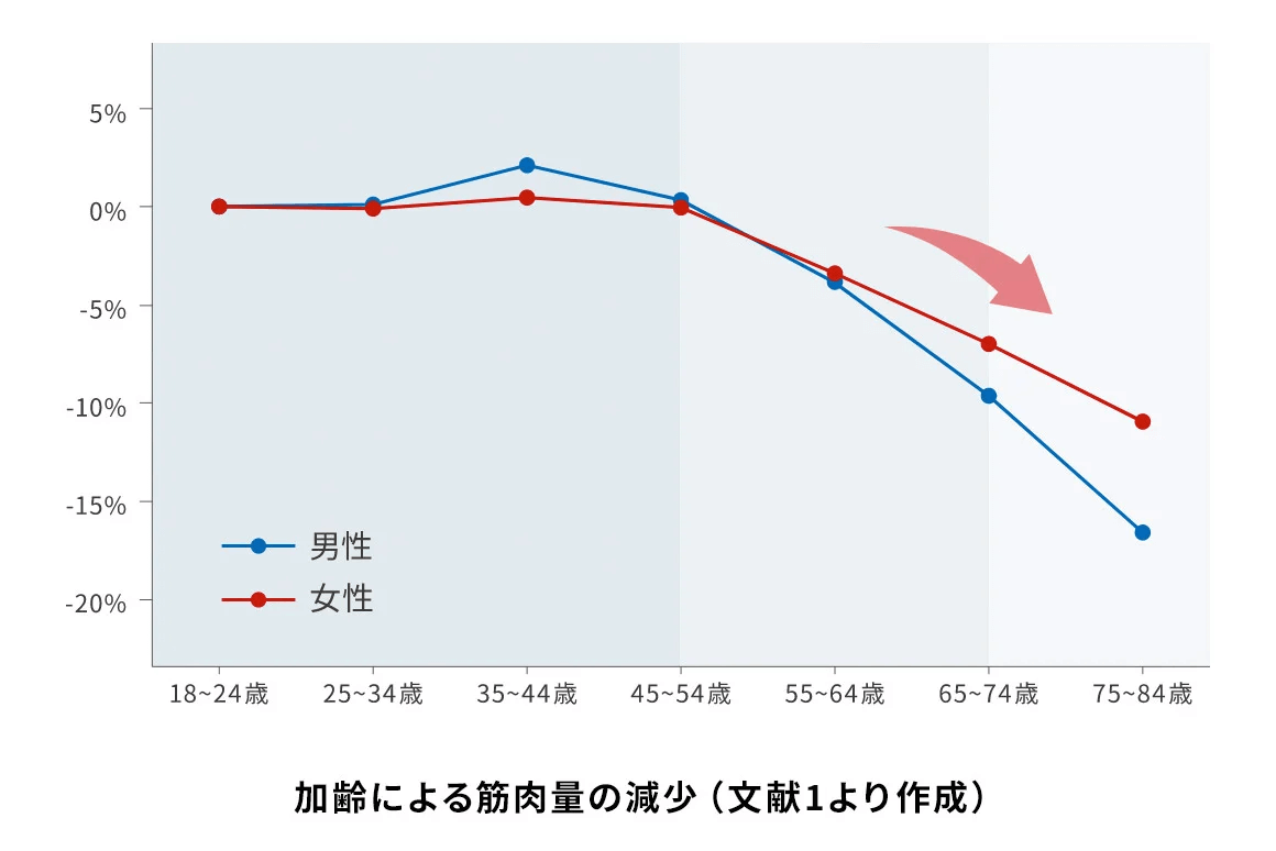 40代以降、筋肉は衰えやすく1)、これにより要介護や死亡のリスクが高まるなど、健康に対してさまざまな悪影響を及ぼすことが明らかになっております2,3)。そのため、特に高齢者では、体脂肪が過剰になりすぎないようにだけでなく、筋肉が衰えないようにも気をつける必要があります。そこで、体組成評価を行うことで、脂肪が多いのか筋肉が少ないのかを分析し、その方に則した適切な積極的な栄養指導と運動指導を行うことが可能となります。また筋肉の低下は特に下肢(両脚)で顕著であるとされていますので4)、全身の筋肉量よりも、部位別の変化に着目することが効果的です。