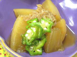 1 大根は乱切りにし、ゆでこぼします。オクラは茹でておきます。