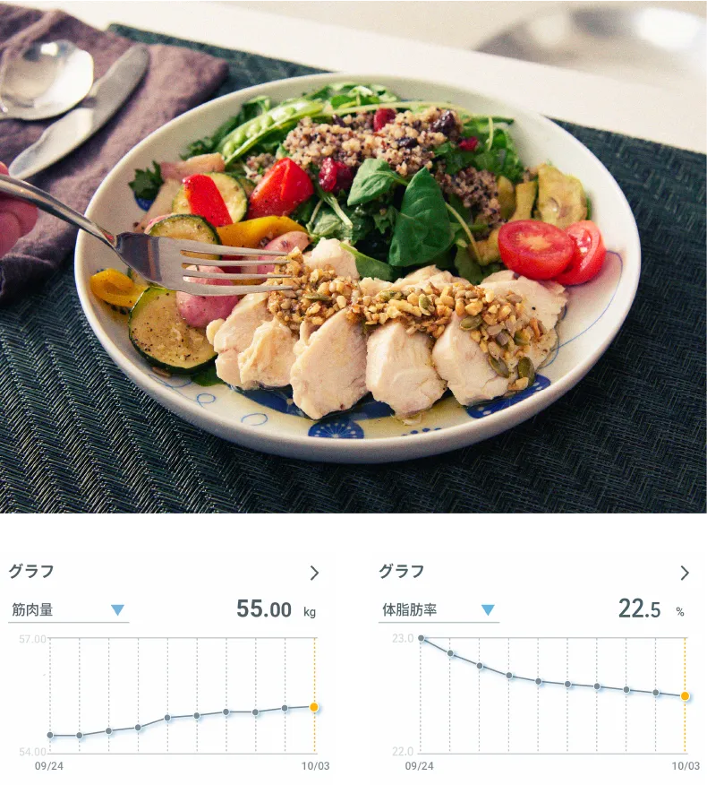 体組成計で、日々の食事や運動などの生活習慣の答え合わせをしています。「理想のからだを維持できているか」を確認しつつも、数字に一喜一憂はせず、長い目で見た時のからだづくりの指標にしています。出かける前や服を着替える前にはかることが、「今日はどう過ごそうか?」と自分と向き合う時間にもなっています。