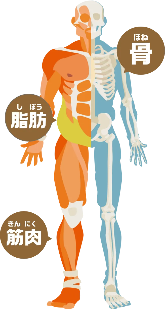 体組成計を使うと、体重・体脂肪率・筋肉量・推定骨量がわかるよ!