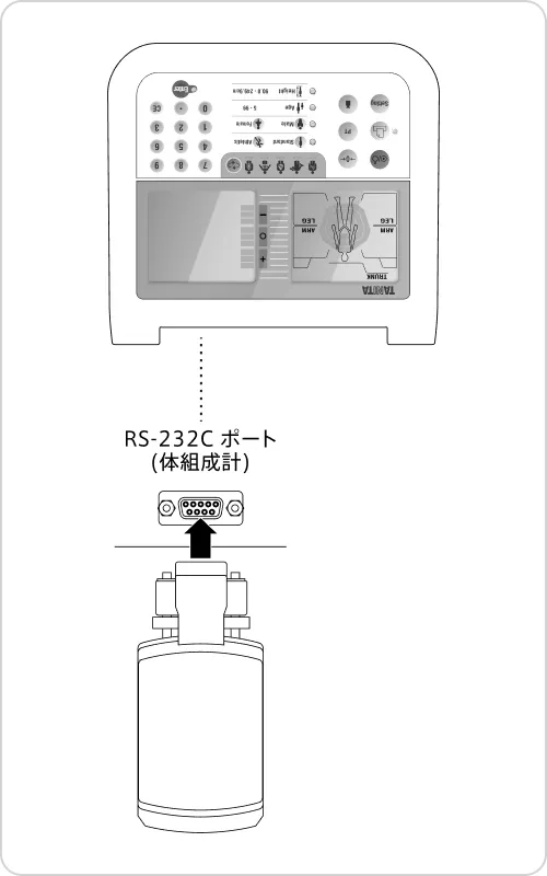 1.ワイヤレスアダプター(OP-102-R1)を体組成計の背面にあるRS-232Cポートに取付けます。