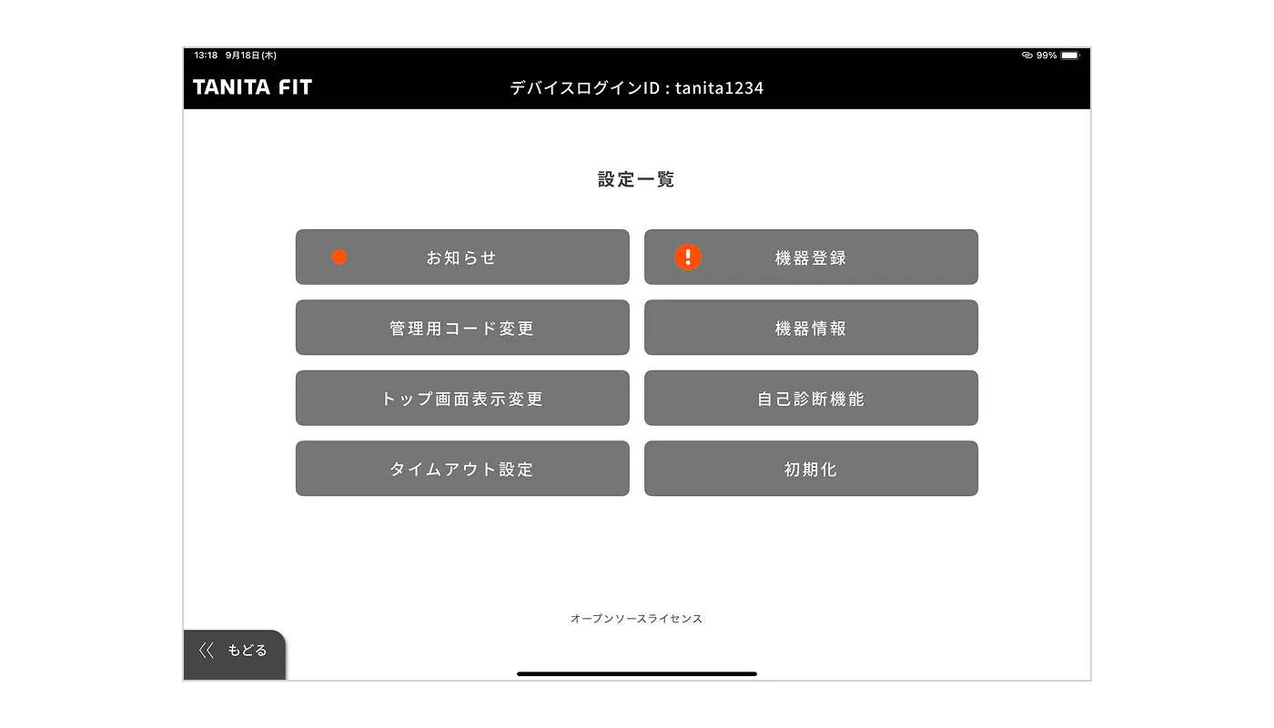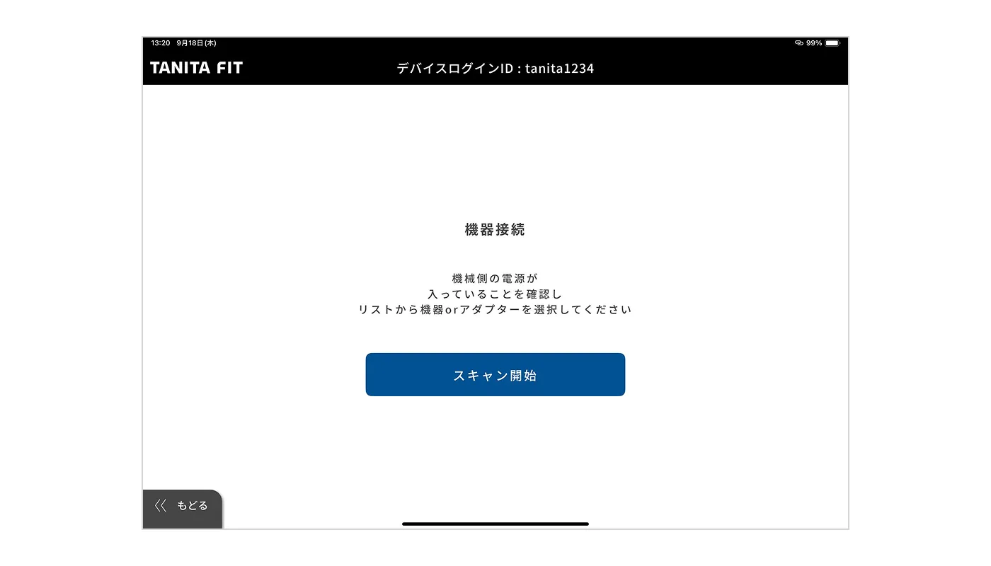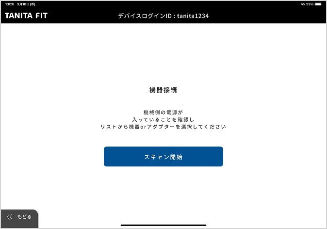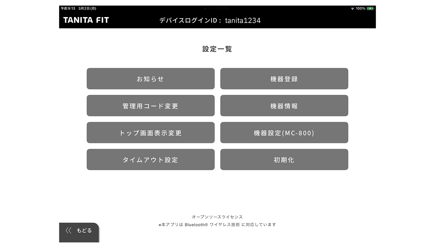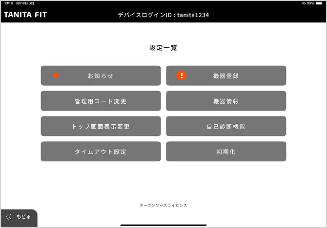 1.事前に、TANITA FIT 管理者webにログインし、デバイスログインIDとデバイスログインパスワードを設定してください。「設定」→「デバイスログインID一覧」より登録できます。