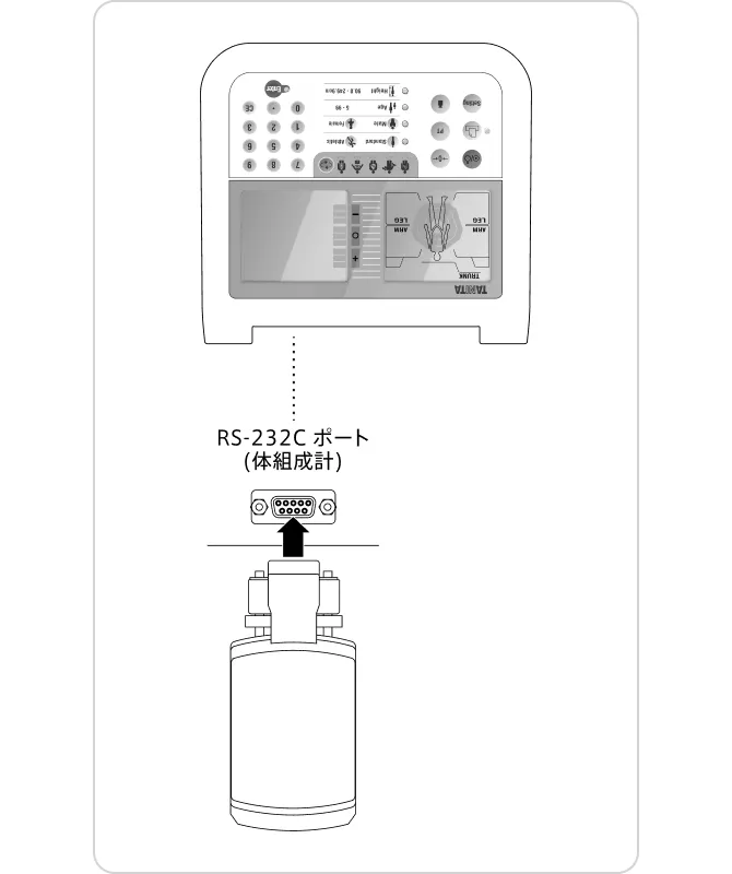 1.ワイヤレスアダプター(OP-102-R1AC)を体組成計の背面にあるRS-232Cポートに取り付けます。