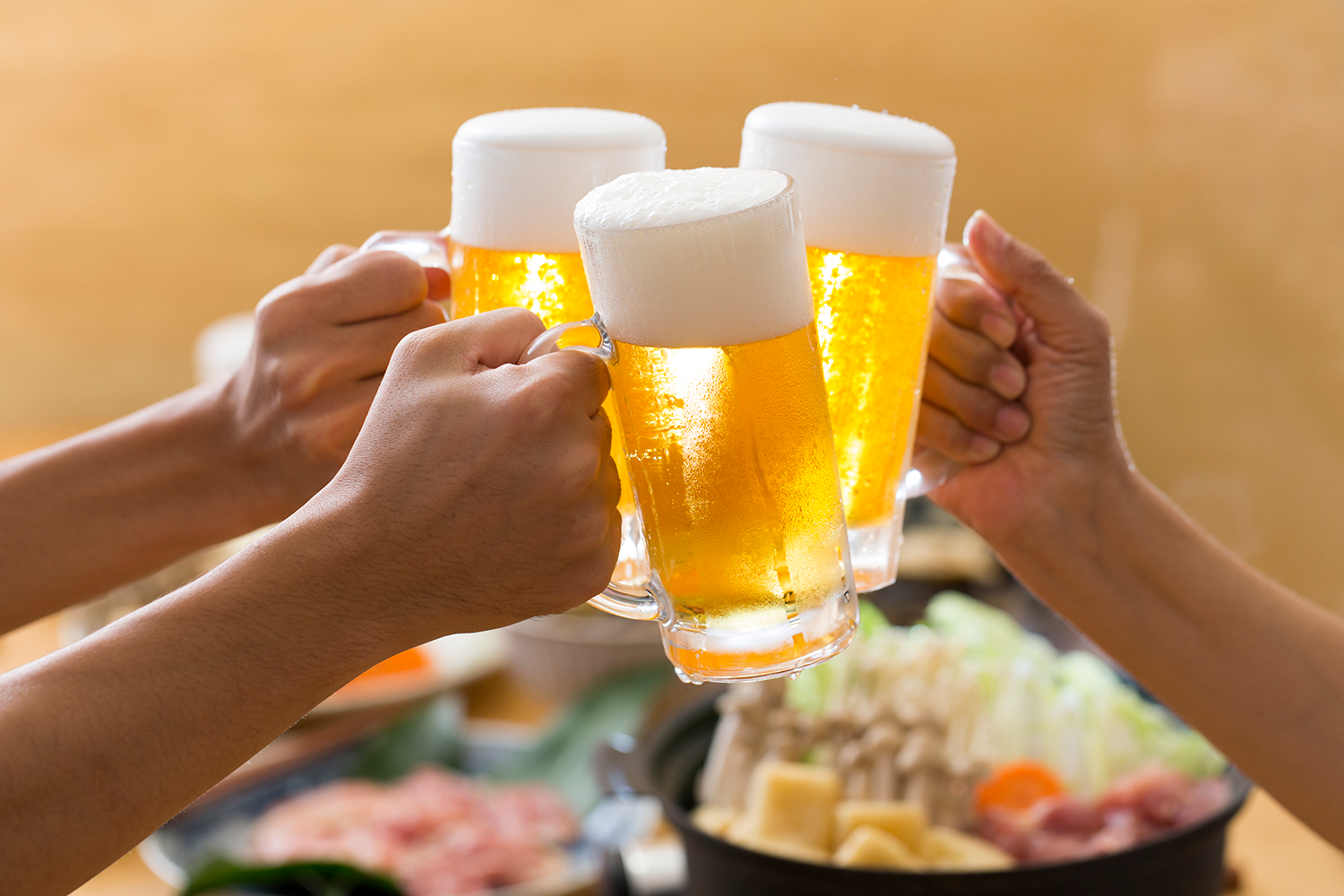 適正な飲酒量は、純アルコールで1日約20g程度(ビール中瓶1本や日本酒1合に相当)が目安とされており、男性は44g以上、女性は22g以上の習慣的な飲酒で生活習慣病発症のリスクが高まると報告されています。飲み会が続く時期こそ、お酒を飲む量を意識することが大切です。