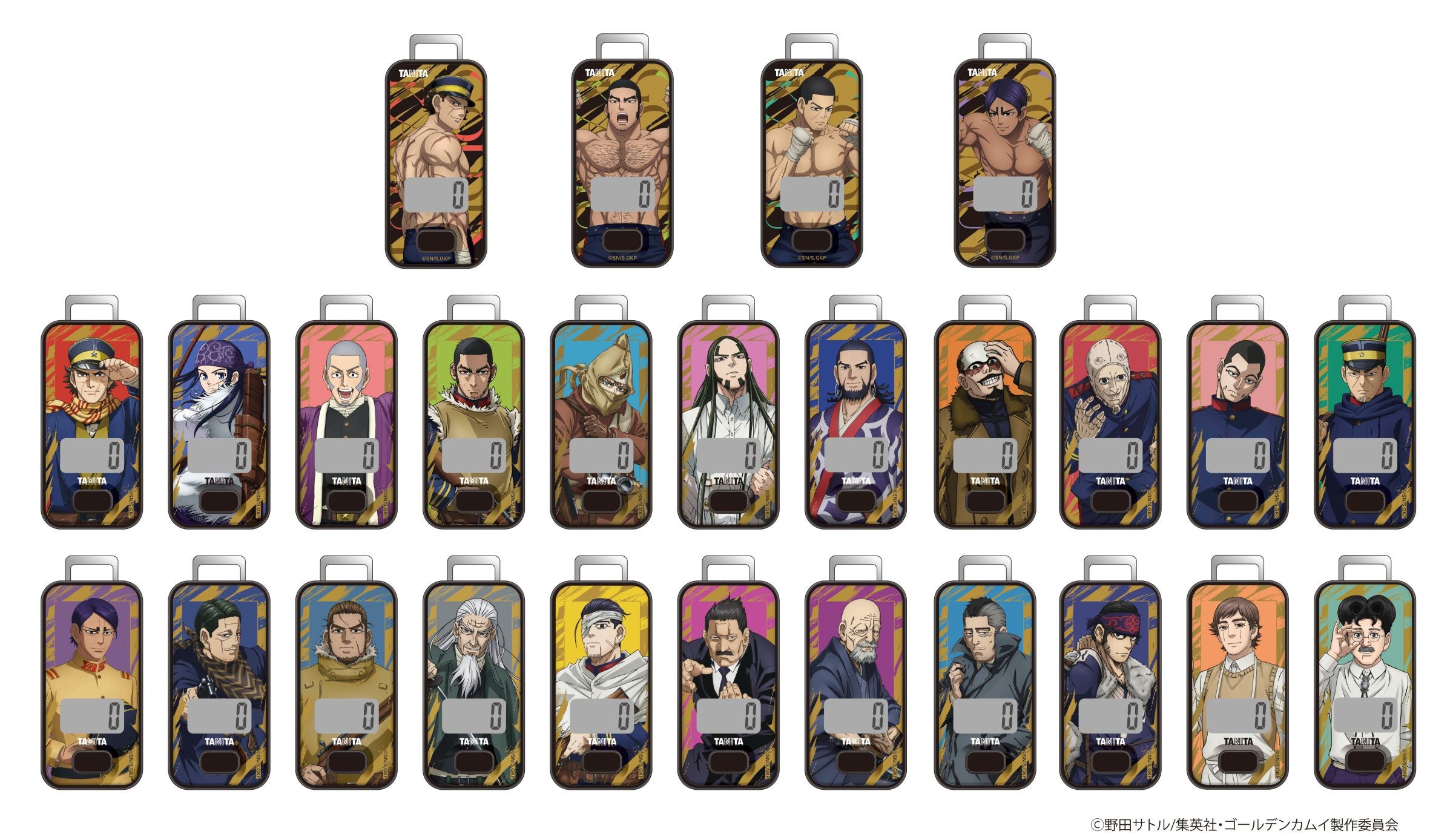 歩数計には3Dセンサーが搭載されており、付属のストラップで首から下げるのはもちろん、バッグやポケットに入れた状態でも歩数を正確にカウントできます。デザインは、アシㇼパ、白石、土方一派、第七師団など同作のキャラクター22種類をはじめ、音声体組成計同様に描き下ろしイラストを使用した杉元、谷垣、月島、鯉登の4種類を加えた全26種類をラインアップ。各キャラクターの背景には、それぞれの個性を表すカラーを基調として魅力を引き立たせました。