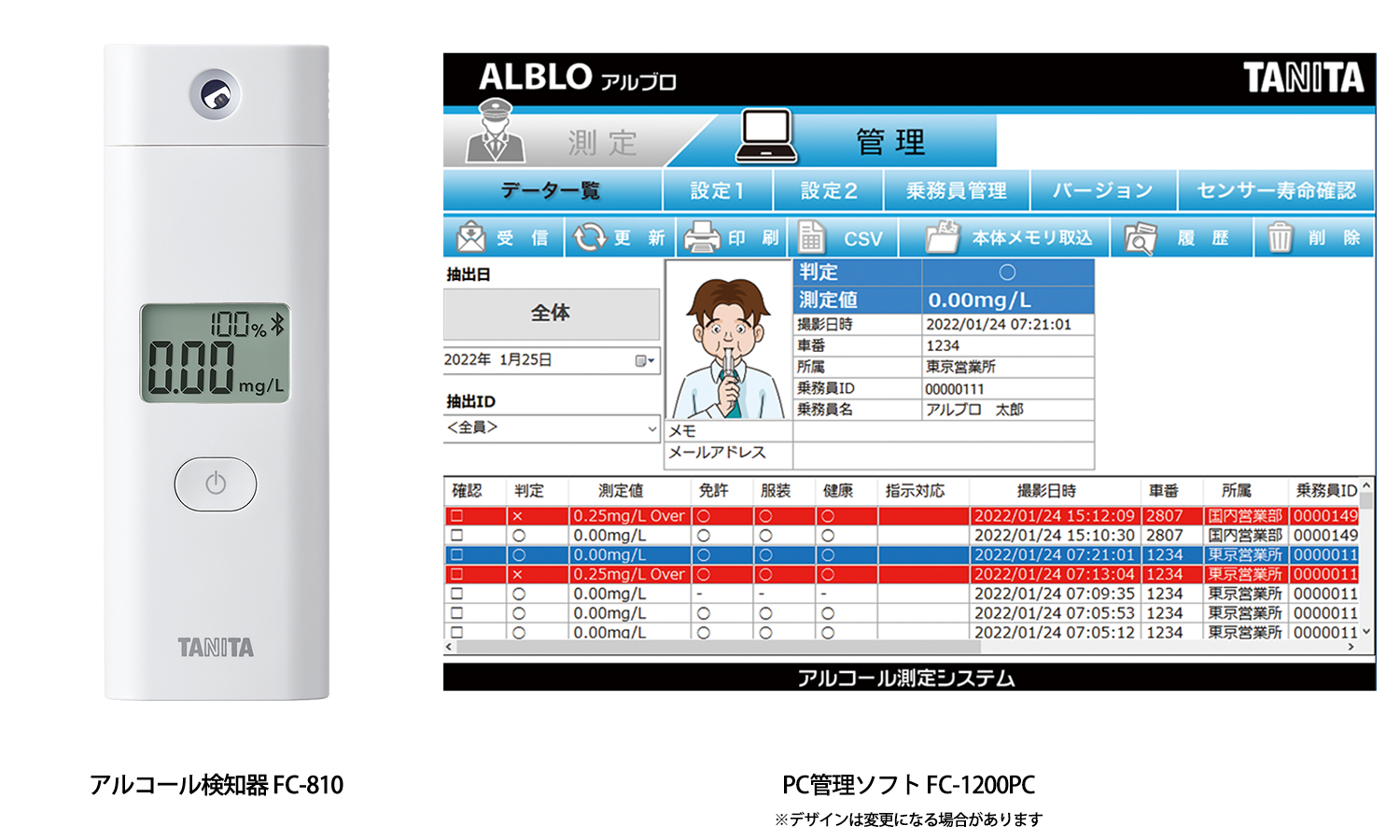 タニタのアルコール検知器FC-810がPC管理ソフトFC-1200PCに対応し、測定結果を管理できるようになりました。