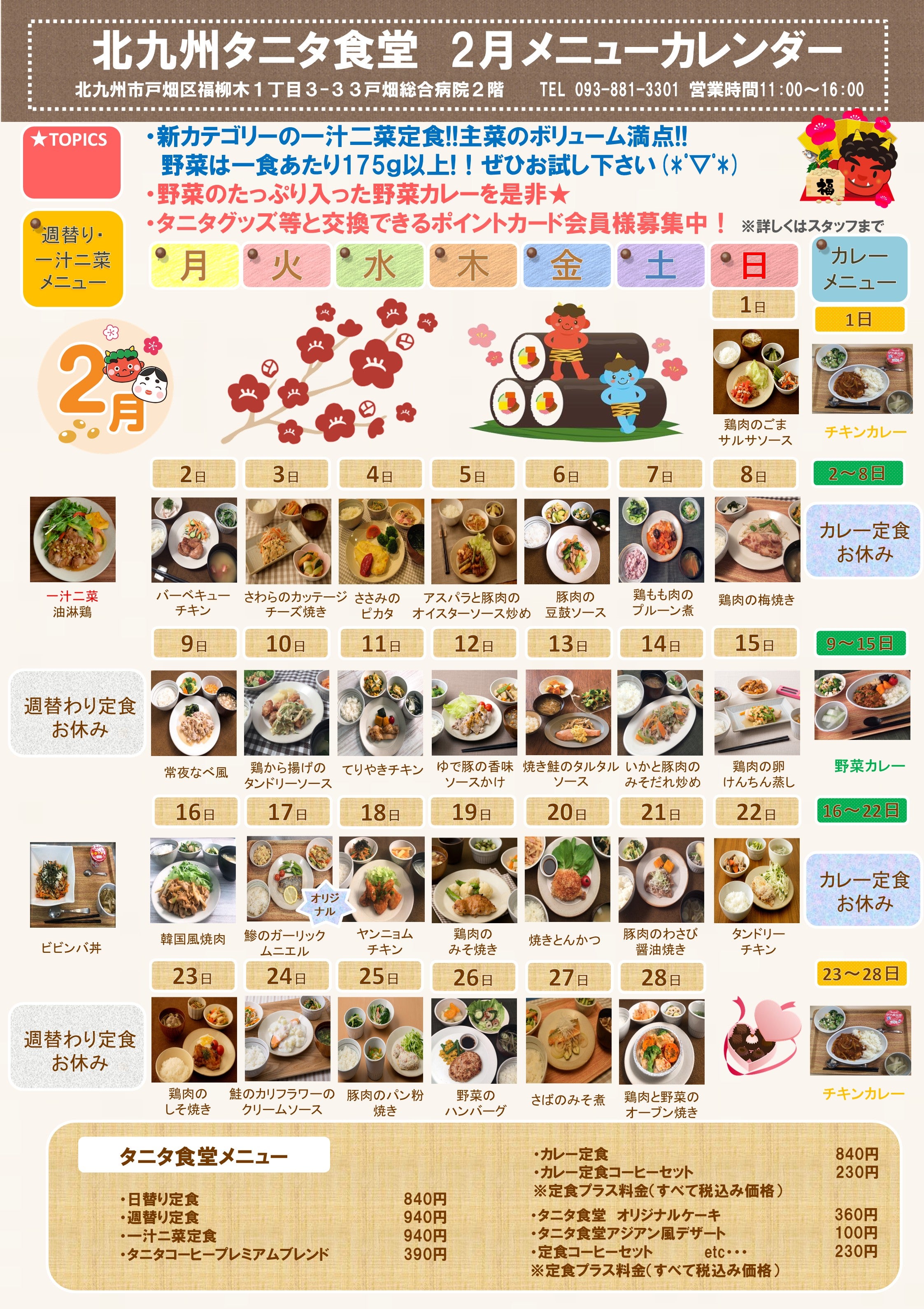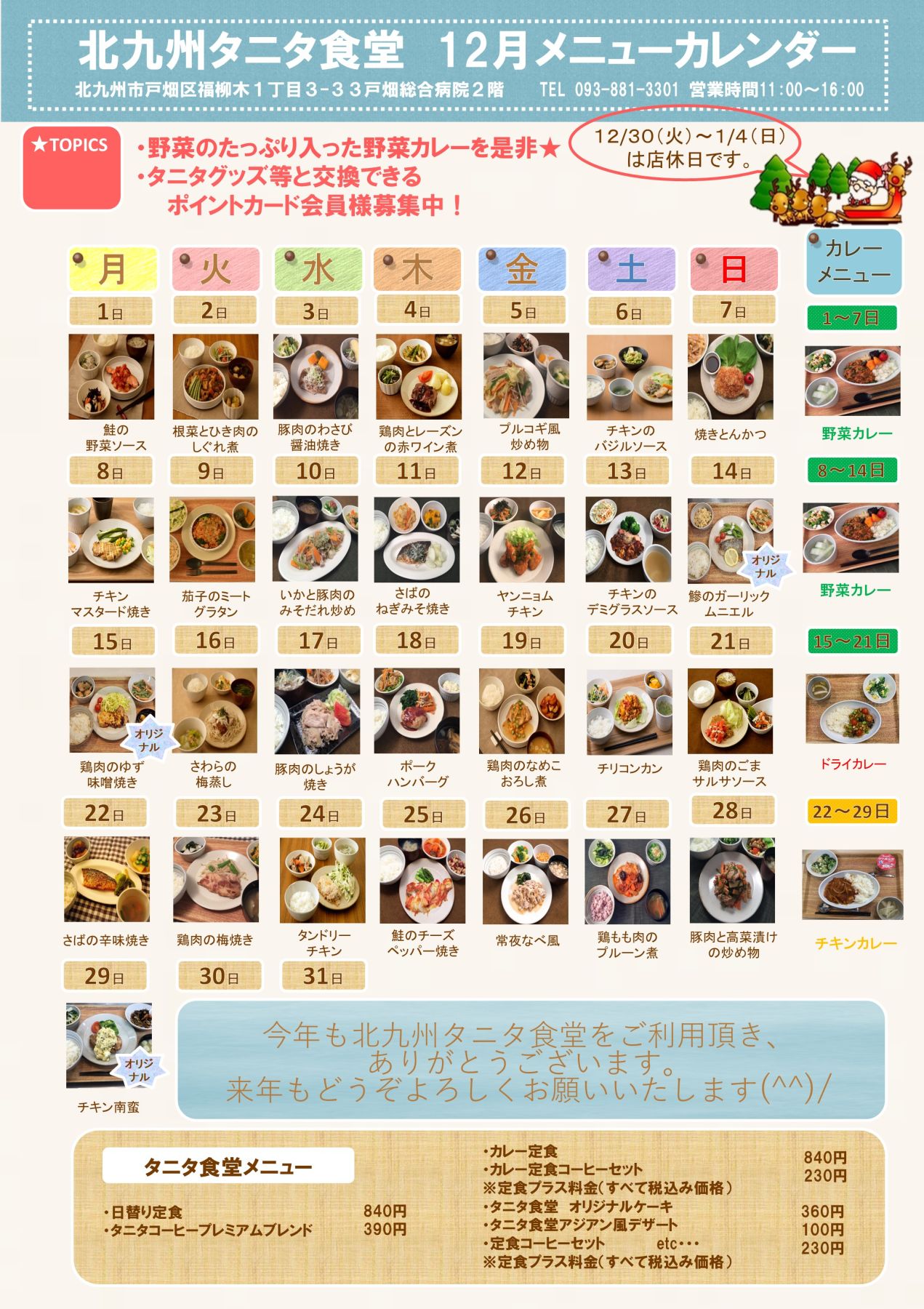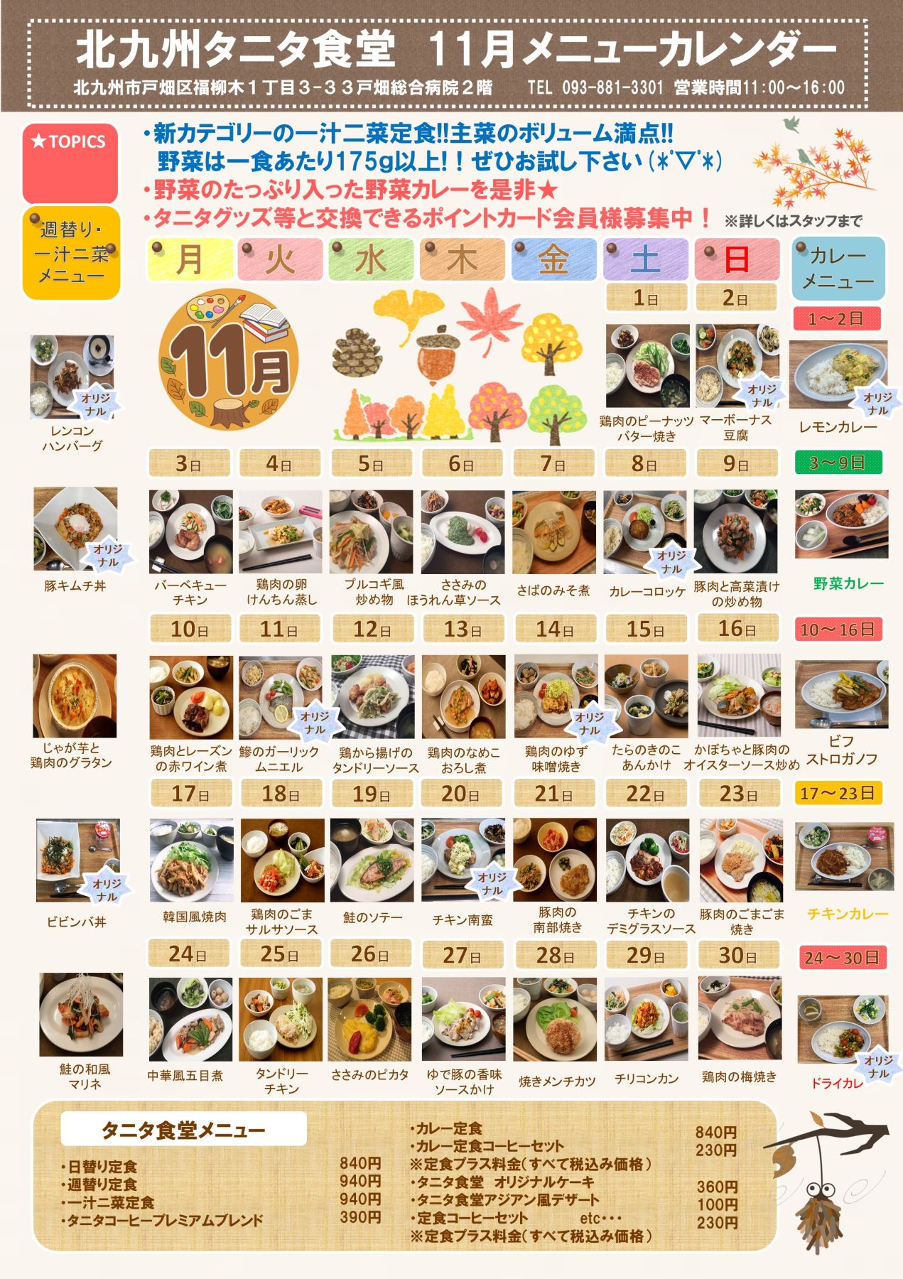 【北九州 タニタ食堂 メニューカレンダー】 ※画像をクリック頂くと、拡大してご覧いただけます。 ※食材調達の都合上、一部変更になる場合もございます。